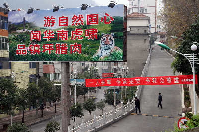 “游自然國(guó)心、聞華南虎嘯、品鎮(zhèn)坪臘肉”,矗立在陜西鎮(zhèn)坪縣街頭的巨幅廣告牌,于上周悄悄地被撤換了。在陜西省林業(yè)廳公布虎照不久,鎮(zhèn)坪縣立即打出“虎嘯”牌,并被到訪各路媒體關(guān)注,網(wǎng)友戲謔為“借虎照,促旅游,太心急”。廣告牌上周悄然被撤下后,“華南虎照”在鎮(zhèn)坪縣政府大院內(nèi)再成談資,不過(guò),在官方層面,“華南虎照”并未引起過(guò)多重視,官員“一如既往地平靜”。