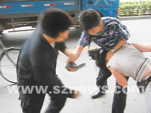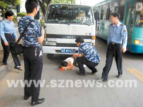 前天下午5時,南頭街道綜合執(zhí)法隊在南頭古城東門口例行巡查時,發(fā)現(xiàn)多個小攤販占道經(jīng)營。見到執(zhí)法人員從車內(nèi)走出來,不少小攤販自覺收起小推車走人。但是,一名賣菠蘿的女?dāng)傌溡姷綀?zhí)法人員后,仍然我行我素。執(zhí)法人員只好將其小三輪車暫扣下來。但女?dāng)傌溡幌伦鱼@入執(zhí)法車下面不肯出來。一名執(zhí)法人員去拉她出來的時候,被她抓傷。女?dāng)傌溸聲稱,“你們不讓我擺攤,我就不讓你們好過!”。
