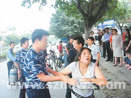 這個暴力抗法的女?dāng)傌溡驯粠项^派出所接受調(diào)查,并被處以三天拘留懲罰。同一天,桃源街道也發(fā)生了暴力抗法事件。16名綜合執(zhí)法隊隊員受傷。桃源街道黨工委書記、辦事處主任廖澍華說,在執(zhí)法時錄像的隊員比較容易受到攻擊,建議錄像時是否可以著便衣,或分開行動。(賴良青)