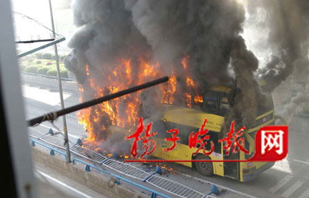 昨天上午7時(shí)55分,一輛雙層100路公交車(chē)在南京市雨花西路高架橋沿線(xiàn)尾部發(fā)生自燃,濃煙升騰數(shù)十米。時(shí)值上班高峰,公交車(chē)內(nèi)有乘客60多位。一騎車(chē)上班的市民發(fā)現(xiàn)火情后,奮追100多米,向駕駛員通報(bào)火情,隨即司機(jī)停車(chē)并及時(shí)疏導(dǎo)乘客,后因火勢(shì)太大,公交車(chē)瞬間成了“火”車(chē),還危及地鐵中華門(mén)站10多米高正在運(yùn)行的地鐵線(xiàn)。隨即,消防官兵趕到現(xiàn)場(chǎng),撲救大火。整個(gè)過(guò)程中,沒(méi)有乘客受傷。但是大火將公交車(chē)燒成了一個(gè)空殼,烤化了附近的店家門(mén)面招牌,熏黑了地鐵柵欄,道路旁的植物也被烤死。