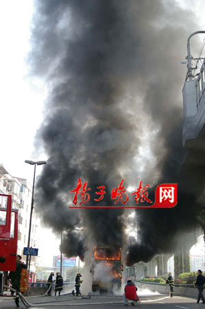 乘客下車(chē)3分鐘后,大火愈燒愈烈,濃煙躥到了3層樓高,火苗肆意地舔食著高架橋底部的線(xiàn)路和植物藤蔓。塑料味、油漆味伴著玻璃的爆炸聲和發(fā)動(dòng)機(jī)附近的爆炸聲陣陣傳來(lái)……8:15,消防官兵趕到現(xiàn)場(chǎng),迅速展開(kāi)撲救。但是大火已經(jīng)將整輛車(chē)吞沒(méi),最后留下的只是一個(gè)黑殼。后來(lái)這輛公交車(chē)殘骸被拖走。9時(shí),雨花西路路段恢復(fù)通車(chē)。