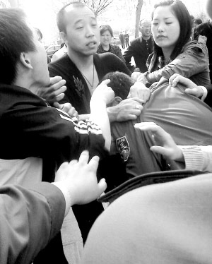13日15時(shí)25分,讀者張先生撥打本報(bào)熱線反映說(shuō),數(shù)人正圍毆執(zhí)法人員。幾分鐘后,記者趕到現(xiàn)場(chǎng),兩名執(zhí)法人員躺在地上,其中劉奇嬌已經(jīng)昏迷,旁邊有嘔吐物,同事張君毅正掐著他的人中,緊急搶救。王某在旁邊高聲叫喊:“執(zhí)法人員打人了!比欢,正在圍觀的群眾張林友讓記者看了他用手機(jī)拍的照片,生氣地說(shuō):“真是惡人先告狀,是他們喝酒后打執(zhí)法人員的!