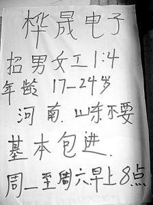 眼下正是不少企業(yè)的招工旺季,然而,一邊是缺工,一邊卻是“歧視”。4月10日,記者在江蘇省昆山市一家職介公司看到,一企業(yè)招工簡章上明確注明:河南、山東人員不要。不少求職者對此表示疑惑和反感,稱屬于地域歧視,而招聘方解釋是為了方便管理。 (李俊鋒攝)