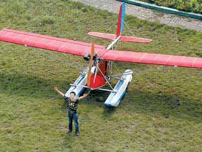 昨日上午9點,彭聰和4名“機務成員”開始組裝水上飛機。記者看到,整個飛機由鋁制管件制成,前翼為紅色的航空帆布,后翼由紅、黃相間的航空帆布組成。飛機的升降舵、垂直和水平安定面、測速表、高度表一應俱全。