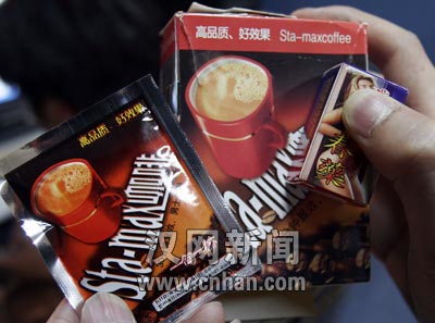 火鳳凰成人保健用品公司的貨架上還擺了一種催情咖啡,沒有廠名、廠址,方形外包裝與雀巢咖啡十分近似,每盒有8小袋。說明稱每袋催情咖啡對入150毫升開水沖泡,30分鐘見效。店員稱其口感與速溶咖啡類似,批發(fā)價每盒18元。