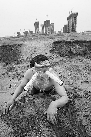 “這就是垃圾場(chǎng),我們生活的地球已經(jīng)被垃圾覆蓋,我們安睡的地點(diǎn)就在垃圾的包圍之中!痹诰嚯x宋莊鎮(zhèn)1公里遠(yuǎn)的一片空曠地,堆滿了各種垃圾廢料,在蚊蠅的環(huán)繞下,藝術(shù)家們抬來(lái)一張床,一名男子躺在床上,全身被白布包裹,上衣被人剪開(kāi)后,一只鬧鐘被捆綁在左胸前,隨著鬧鐘秒針的跳動(dòng),生活在垃圾包圍中的他,生命也向“死亡”逐步靠近。