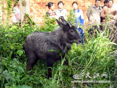 無獨有偶,昨日下午3時,距都昌縣中館鎮(zhèn)幾公里的鄱陽縣銀寶湖鄉(xiāng)銀寶村農(nóng)民馮奇,在自家門前的菜園內(nèi)發(fā)現(xiàn)一只“野山羊”在偷吃菜葉。只見這家伙身高1.2米左右,體重約100公斤?吹接腥藝^,“野山羊”飛快逃竄,村民們四處堵截,3個小時后才將它在一條胡同內(nèi)制服。鄱陽縣林業(yè)局的野保專家趕到現(xiàn)場告訴村民,這只“四不像”學名叫蘇門羚。