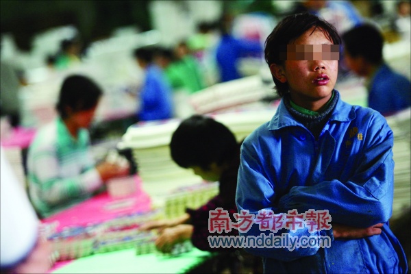 塘廈某職業(yè)介紹所的王主任常常來此挑選工人。他說,這些待選的工人,都是工頭們從四川涼山地區(qū)帶來打黑工的,其中的60%是童工。因為這些涼山來的工人要價低,大約只要2.5元-3.8元/小時,而且不需要任何福利保障,干活又很拼命,能吃苦,所以很受工廠老板的歡迎。這位王主任做了個保守推算稱,在整個石排,工廠主隨時可以抽調(diào)出六七百名這樣的廉價涼山童工。