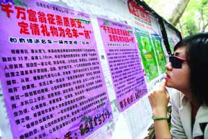 宿舍樓旁的路上,還有一些人在向來往的女生發(fā)放“征婚啟事”廣告單。多數(shù)女生坦然接受,毫不羞澀,也有一些女生捂住嘴巴,有些難為情。記者詢問一位女生對這類征婚是否感興趣,她大方地說:“我正在讀研,也是適婚年齡,他的條件的確很誘人啊,把號碼先記著,沒準(zhǔn)也能見見面呢!