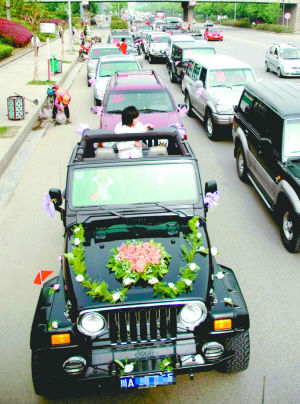 三菱帕杰羅、陸地巡洋艦、大切諾基、豐田普拉多、本田CRV、牧馬人……昨日上午,52輛各種品牌的越野車,組建成綿延1公里長的婚車隊伍,從西門穿城到東門迎娶美麗的新娘子,又浩浩蕩蕩地朝東湖公園婚禮現(xiàn)場進發(fā),好不拉風!新娘子說:“戀愛8年啦,就想要這么一場轟轟烈烈的婚禮!”