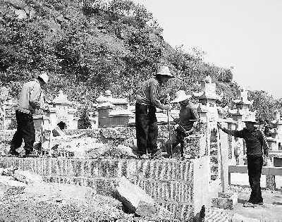 4月27日,記者到這里時,當(dāng)?shù)卣M織村民正在拆墓。墓主體由巖石搭建,墓前有篆刻碑文。碑上有出生日期沒有死亡日期的墓是活人墓,有碑但沒有碑文的則是空墓。村民老黃告訴記者,他正在拆的墓有不少是去年才買的,少的要1萬元左右。