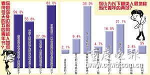 對“過青年節(jié)”,32.7%的人抱無所謂的態(tài)度,32.6%的人表示不喜歡過青年節(jié),他們認為這個節(jié)日只是停留在名義上的傳統(tǒng)節(jié)日,諸如講座、演講之類的紀念活動毫無吸引力。