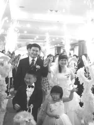中午12時30分,婚禮正式開始。叮叮和小伙伴一人手提一個裝滿花瓣的小花籃,在玫瑰花亭下站好。當(dāng)主持人宣布新人入場時,兩人相對而立,隨后帶領(lǐng)新郎新娘緩緩踏上紅地毯。叮叮右手提著花籃,左手抓起一把玫瑰花瓣,用力向空中撒去,始終笑呵呵的,直到把新人帶到婚禮主舞臺。這時,伴娘送上一個“仙女棒”,“我是愛神派來的小天使,我來喚醒你們的愛情……”叮叮拿起“仙女棒”,踮起腳尖走到新郎新娘面前,朝新人手中的水晶球輕輕一點,只見水晶球里藍(lán)光四射,現(xiàn)場掌聲一片。