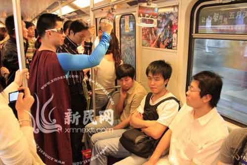 據(jù)新民網(wǎng)了解,網(wǎng)友yinzeqing在SJTUNews討論區(qū)所發(fā)表一則帖子被各大論壇轉(zhuǎn)載,引起網(wǎng)友極大興趣。該帖子主要內(nèi)容為一組在地鐵一號(hào)線拍到的“超人”照片。圖片里有一個(gè)男子批紅色斗篷、穿藍(lán)色緊身衣、內(nèi)褲外穿,戴著墨鏡大搖大擺乘起了地鐵。