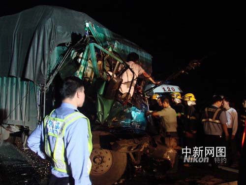 事發(fā)8日晚上22時(shí)許,離韶關(guān)市區(qū)南約80公里的京珠高速公路距韶關(guān)翁城出口一公里處,一輛湖南號(hào)牌大貨車(chē)追尾撞上一輛廣東號(hào)牌大貨車(chē),追尾大貨車(chē)的駕駛室嚴(yán)重變形,車(chē)頭向內(nèi)凹進(jìn),駕駛室內(nèi)3 名人員受傷被困,其中副駕駛員情況最嚴(yán)重,滿(mǎn)臉是血,身體被嚴(yán)重變形的車(chē)頭損壞部件死死卡住,不時(shí)發(fā)出低微的求救聲。