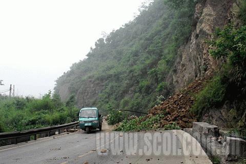 5月12日17點(diǎn)11分,都江堰往汶川方向的道路出現(xiàn)大面積山體跨塌