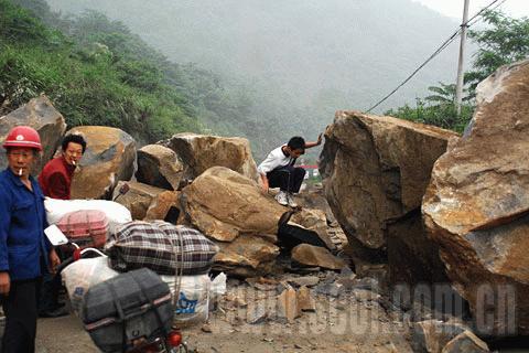 5月12日17點(diǎn)14分,都江堰往汶川方向道路被山頂滾落的巨石阻斷,車輛無法通過,路人試圖翻越巨石堆