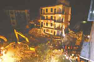 文化鎮(zhèn)中心;锸硤F(tuán)職工曾家福介紹,綜合樓是1995年下半年建的,1996年秋投入使用。水泥欄桿掉光的教學(xué)樓是1994年所建。記者看到,綜合樓屬預(yù)制板式樓房,垮塌的廢墟中橫七豎八地倒著預(yù)制板,僅橫梁可見(jiàn)少量鋼筋。 記者冉啟虎