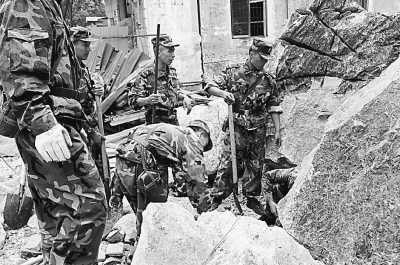 當天凌晨,解放軍某部的2000余名官兵,一進入綿陽市北川縣城,就開始了緊張的救災工作。