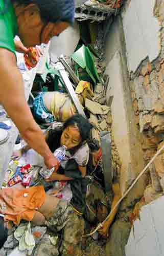 在這里,一名親見女兒身體卻拉不出來的母親在哭泣,記者見證了一個震撼人心的場面:一、二層間還存在一個不到一米的夾層,一名穿綠衣的高中女孩已經(jīng)爬出,返身去拉那名也已大半個身子爬了出來的那名母親的女兒,此時夾層房梁塌下來,二名女孩保持著返身救人和伸手待救的姿態(tài),被砸在了主梁下面,她們離生其實只差半步之遙。