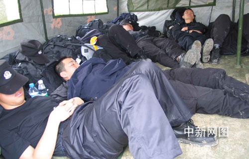 駐地的環(huán)境較差,民警、戰(zhàn)士多是通宵作業(yè)后只在路邊稍作休息后又繼續(xù)投入救援作業(yè)。