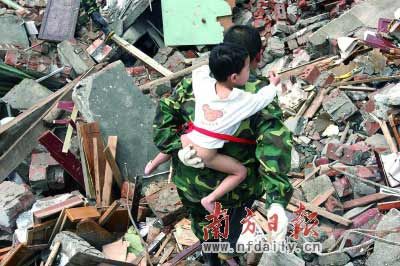 昨日下午5點,記者第三次深入北川縣城核心現(xiàn)場,發(fā)現(xiàn)一股從背后深山逃出的人流。他們的眼神充滿對親人的依戀,生怕再次分開。11歲的張吉萬背著3歲半的妹妹張韓,非常吃力地走著。同行的爺爺、奶奶已經(jīng)老了,父母在外打工,小吉萬就勇敢地?fù)?dān)負(fù)起小男子漢的責(zé)任。早上5點出發(fā),已經(jīng)走了12個小時了。小吉萬說,他很愛妹妹。