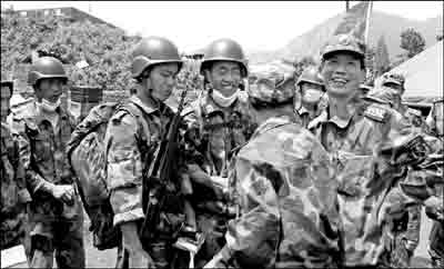 “我們來(lái)唱支軍歌吧!2008年5月18日11時(shí)30分,空降兵某軍指揮官戴志強(qiáng)站在已成孤島的綿竹市三江村,對(duì)前方奔騰而來(lái)的巨石大喊時(shí),56名災(zāi)民已乘坐直升機(jī)安然離去。