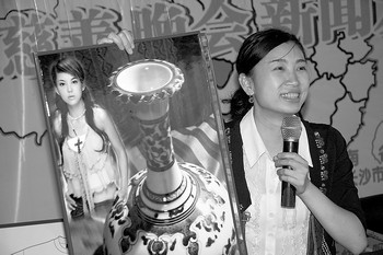 晚會導(dǎo)演郭翼向大家介紹李湘將在晚會現(xiàn)場拍賣的青花瓷。陳飛 攝