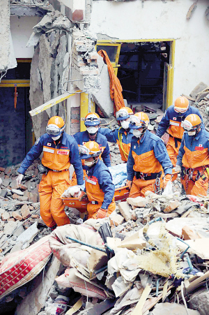 昨晨(5月18日),在重災區(qū)(四川省)綿陽市北川縣北川中學施救現(xiàn)場,多了幾十名國外救援者的身影——他們是日本國際應急援助隊的隊員。截至昨下午1時,日本救援隊已找到深埋樓底的6名學生遺體。