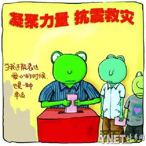 在天涯社區(qū)張貼的漫畫里,小鴨子表情嚴(yán)肅地對小雞說:“賑災(zāi)重建,長期任務(wù)”;三只小老鼠不停用鐵鍬挖坑蓋房,還拿著大喇叭高喊:“眾志成城,共抗震災(zāi)”;“蘑菇家族”的醫(yī)生則身背降落傘空降災(zāi)區(qū)……
