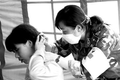 來到前線,尹萍除了救治災(zāi)民外,還要負(fù)責(zé)給尸體消毒。只要挖出的尸體一露出頭或腳,尹萍就會(huì)第一個(gè)沖上去給尸體消毒,再由戰(zhàn)士抬出來。由于許多戰(zhàn)士都是第一次接觸尸體,多少有點(diǎn)害怕,抬一具尸體就要換個(gè)口罩。尹萍總會(huì)上前安慰:“尸體沒有腐爛就沒有毒,大家不要怕!