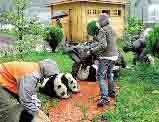 5月20日,四川臥龍中國保護大熊貓研究中心熊貓園里,大熊貓們驚恐地擠在一起。往日這里竹子竹筍成堆,而今卻不見一星半點,一只熊貓去抓籠外的觀賞竹吃,另一只熊貓居然抓了一把青草塞在嘴里。由于缺乏竹子、蘋果等食物,熊貓們只能在工作人員的幫助下學(xué)喝粥。