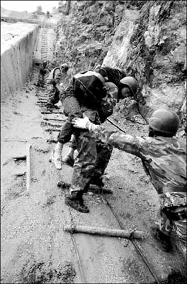 戰(zhàn)士們立即打著手電迎了過去。近了,越來越近了,在手電光中,40多個互相攙扶的人影出現(xiàn)在戰(zhàn)士們面前。戰(zhàn)士們話音未落,人群中哇地響起一片哭聲。戰(zhàn)士們趕忙迎上去將他們扶到洞口,然后每一名受災(zāi)群眾都被一名戰(zhàn)士用保險繩系在腰間,護送他們一步一步走下軟梯。
