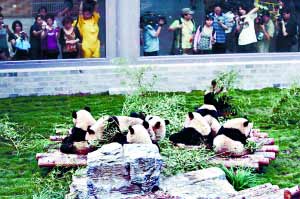 記者還了解到:昨天傍晚,8只大熊貓到達北京動物園時,國內(nèi)外近百家媒體的記者和數(shù)百名游客夾道歡迎。