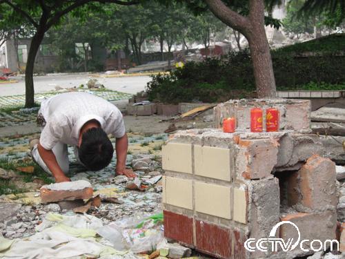 “孩子們,沒有全部救出你們我很內(nèi)疚,我會(huì)記住你們忌日的,每年的這一天我都會(huì)來看你們,給你們送學(xué)習(xí)用品。你們生前都很團(tuán)結(jié),在天堂也要相互關(guān)照好,老師每天都在想念著你們!”在北川中學(xué)(新區(qū))的廢墟下,記者看到一名中年男子跪在地上,哭得很悲傷,還向遇難的同學(xué)叩拜。記者跑過去一看,此人就是北川中學(xué)的校長劉亞春。他告訴記者,地震后他一直在忙碌搶救學(xué)生的事,沒有時(shí)間來看望這些還埋在廢墟下的數(shù)百名學(xué)生。今天他在百忙之中,抽時(shí)間來看看這些孩子們,他將帶來的蠟燭點(diǎn)燃后放在廢墟下,雙手合十,默默地祈禱,然后跪在地上給在地震中失去生命的學(xué)生磕了三個(gè)響頭。