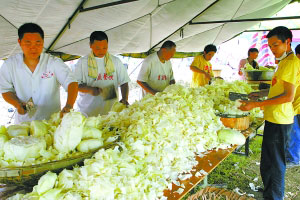 土坡上挖幾個(gè)大坑,直徑一米多的大鐵鍋架起來,半鍋水沸騰,直徑一米的大圓木桶立在鍋中!盎鹜c(diǎn),再旺點(diǎn)!币粋(gè)小伙兒往坑內(nèi)塞木板,他五米外的木板堆,近一人高。旁邊大桶的米飯率先出爐,廚師劉福彬用臉盆當(dāng)飯勺。煮飯區(qū)旁邊,堆起的圓白菜面積像籃球場(chǎng)那么大。幾位女廚用大刀切菜。