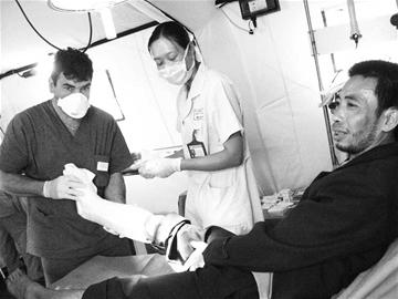 昨日上午10點(diǎn)半,設(shè)在綿竹孝德鎮(zhèn)的意大利醫(yī)療野戰(zhàn)醫(yī)院手術(shù)室里抬進(jìn)了一名在地震中骨折的傷者。汗水從骨科醫(yī)生朱力亞諾·羅迪尼的額頭上滲出來(lái),他一邊比劃著詢問(wèn)傷者的情況,一邊用藥物清洗已經(jīng)感染的部位。此刻,對(duì)朱力亞諾·羅迪尼這樣的國(guó)際志愿者來(lái)說(shuō),他只知道自己是醫(yī)生,他要醫(yī)治好更多的傷者。
