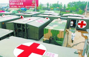 在綿竹市市政府旁邊的2萬平方米的大塊空地上,一個個深綠色的“鐵皮大家伙”敦實地坐落在上。周圍的人告訴記者:“我們看病就鉆進(jìn)那個鐵家伙里面,不怕風(fēng)也不怕雨的,很好!”