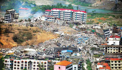 我們所到的地點(diǎn)是與汶川一山之隔的什邡沿山鄉(xiāng)鎮(zhèn),震后的災(zāi)區(qū)真是慘不忍睹!車(chē)進(jìn)什邡洛水地界,倒塌的房屋越來(lái)越多,到處是殘?jiān)珨啾,高大的廠房?jī)A斜了,一座加油站的一根柱子倒在地上,屋頂觸了地,公路中間是寬寬的裂縫,原本蔥蘢的青山上到處是滑坡留下的瀑布一樣的黃色道子。我還看見(jiàn),廢墟上擺放著三頂巨大的棺材,穿著白大褂的防疫人員正在深挖巨坑,并往里面一層層地灑白灰。