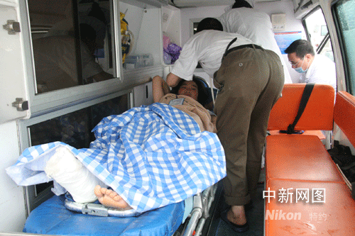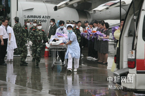 十一點左右,傷員一個個被武警官兵抬出飛機,并送上等候在停機坪上的三十六輛救護車,并被迅速送往浙江金華三家最好的醫(yī)院接受治療。
