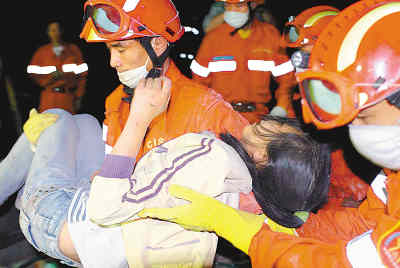 隊員們迅速行動,清理壓在她周圍的樓板斷層及碎石塊,隨行的醫(yī)療隊員張謙和張艷君則在一旁不停地鼓勵她。