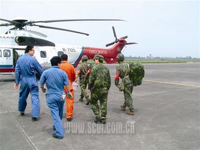 5月21日清晨,廣漢機(jī)場(chǎng)緊張有序地展開營(yíng)救8名被困工人的行動(dòng),多架飛機(jī)飛向綿竹清平大山偵察?战当硯熍沙鲂》株(duì),背著繩索、攜帶衛(wèi)星定位系統(tǒng)進(jìn)行救援。