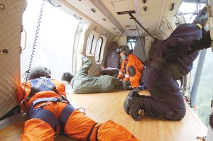 得到前線救援人員通過海事衛(wèi)星報告的消息后,27日下午,救援直升機冒著危險,在距地面10米的空中展開搜索!翱,下面有人影!”飛機盤旋了很久,但因當?shù)赜幸慌琶芗母邏壕,飛機無法降落,眼看大霧越來越濃,救援直升機只得返回廣漢機場待命。