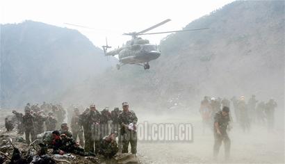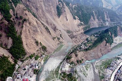 昨日上午9時(shí),記者登上運(yùn)送搶險(xiǎn)物資的直升機(jī),飛機(jī)穿過(guò)北川縣城南端的險(xiǎn)要溝壑后,緩緩飛入四處塌方、滑坡的唐家山山谷。透過(guò)飛機(jī)的舷窗,遠(yuǎn)遠(yuǎn)地可以看見(jiàn)前下方狹長(zhǎng)河堤上有一個(gè)巨型堤壩,堤壩上面的凸出部位依稀可見(jiàn)隨風(fēng)飄揚(yáng)的紅旗!斑@是搶險(xiǎn)部隊(duì)插的,你看上面都有他們的部隊(duì)名稱呢!彪S機(jī)護(hù)送物資的戰(zhàn)士解釋說(shuō)。
