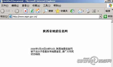 5月29日22點左右,記者登陸陜西地震局網(wǎng)站,已經(jīng)無法看到正常的地震信息網(wǎng)頁面。頁面上只有兩行簡單文字,“2008年5月29日20時53分,陜西地震信息網(wǎng)被不法分子發(fā)布地震謠言,請廣大市民切勿相信!