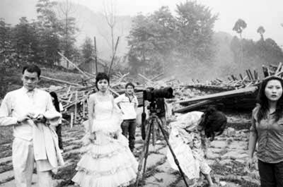 下午4時(shí),現(xiàn)場(chǎng)一家婚紗攝影公司工作車(chē)?yán)锏膹V播聲傳來(lái),說(shuō)四川阿壩藏族自治州的汶川縣位于震中位置。這時(shí),一個(gè)名叫黃芳的新娘開(kāi)始抽噎。黃芳是藏族姑娘,父母、哥哥嫂子、姐姐姐夫還有4個(gè)孩子都在臥龍,那里恰好是震中!