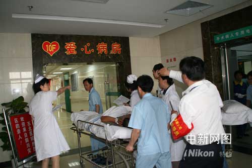 記者坐上載著傷員救護(hù)車,警車開道一路綠燈直達(dá)救治的醫(yī)院,在車上傷員家屬告訴記者:到處都是我們的親人,一路上大家都很受照顧,已經(jīng)感受到家庭的溫暖。下午四時(shí)許,駛進(jìn)蘇北醫(yī)院,為了迎接傷員,醫(yī)院早就開始了準(zhǔn)備,在住院十病區(qū)開辟了 “愛心病區(qū)”。王靜成院長稱,這是我們醫(yī)院最好的病房,醫(yī)院為四十名災(zāi)區(qū)傷員親人配備了經(jīng)驗(yàn)豐富的醫(yī)護(hù)人員,確保醫(yī)療安全,盡量降低致殘率,讓他們安心治病、早日康復(fù)。