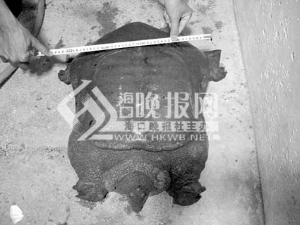 這只大甲魚是幾天前被人從尖峰嶺天池湖上釣起的,重達(dá)40斤。記者看到,這只甲魚背殼很薄,摸上去比較光滑,白色的肚皮上有花斑,顏色略白。經(jīng)測量,甲魚身長約60厘米,寬約45厘米,鱉蓋如臉盆般大小。甲魚發(fā)出的聲音像牛吼一般。
