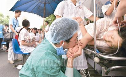 市民們和醫(yī)生心手相連的場面打動了每一位路人,也刺激著我的快門不停響動。透過人群中的縫隙,一幕畫面深深地打動了我的心靈,只見一位身穿手術(shù)服,頭戴消毒帽的年輕男子正蹲在一臺擔架車旁,握著一位虛弱的產(chǎn)婦的手,無言地對視著,他們正等待著小生命的降臨。突然,男子將她的手放在唇邊,輕輕一吻,就像在說:老婆,你不要怕,一定不會有事,我們的孩子會平安降生。按動快門的同時,淚水滑過我的眼眶。
