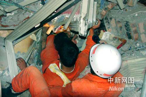 這里還有生命存在!濰坊市公安消防支隊參加救援的官兵迅速聚集在這片廢墟周圍,小心翼翼的搜尋生命奇跡的存在地。這是映秀灣發(fā)電廠的賓館,6層樓建筑已經(jīng)全部垮塌,電廠賓館廢墟堆高約4米,樓板磚墻層層疊壓,上部樓板隨時都有再次坍塌的可能。距現(xiàn)場2米的右側(cè),是一座6層高且遙遙欲墜的未倒塌建筑,余震之中樓體搖搖晃晃,不斷有磚石碎塊掉落,整幢建筑岌岌可危。